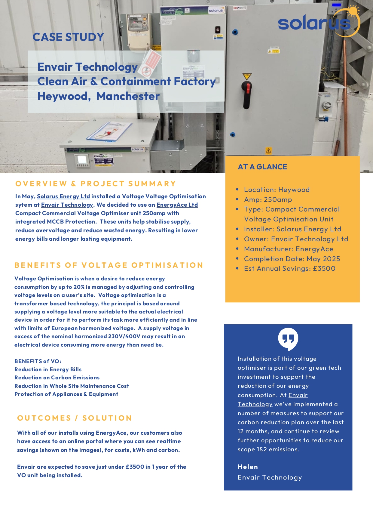 In May, Solarus Energy Ltd installed a Voltage Voltage Optimisation sytem at Envair Technology. We decided to use an EnergyAce Ltd Compact Commercial Voltage Optimiser unit 250amp with integrated MCCB Protection. These units help stabilise supply, reduce overvoltage and reduce wasted energy. Resulting in lower energy bills and longer lasting equipment.